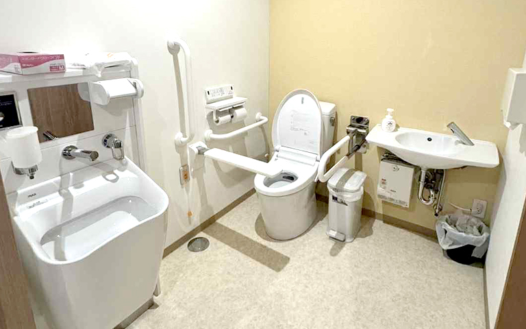 車いすの方がスムーズに利用できる施設内のトイレです。移動や立ち上がりの負担を手すりが軽減しています。